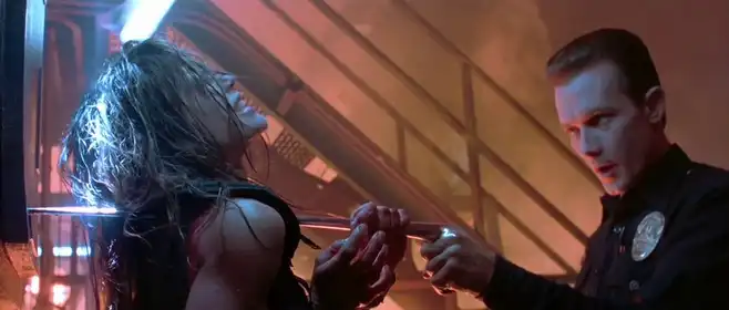 - T‑1000 (Роберт Патрик) — передовой полиморфный терминатор из жидкого металла, практически неуязвимый и чрезвычайно опасный.